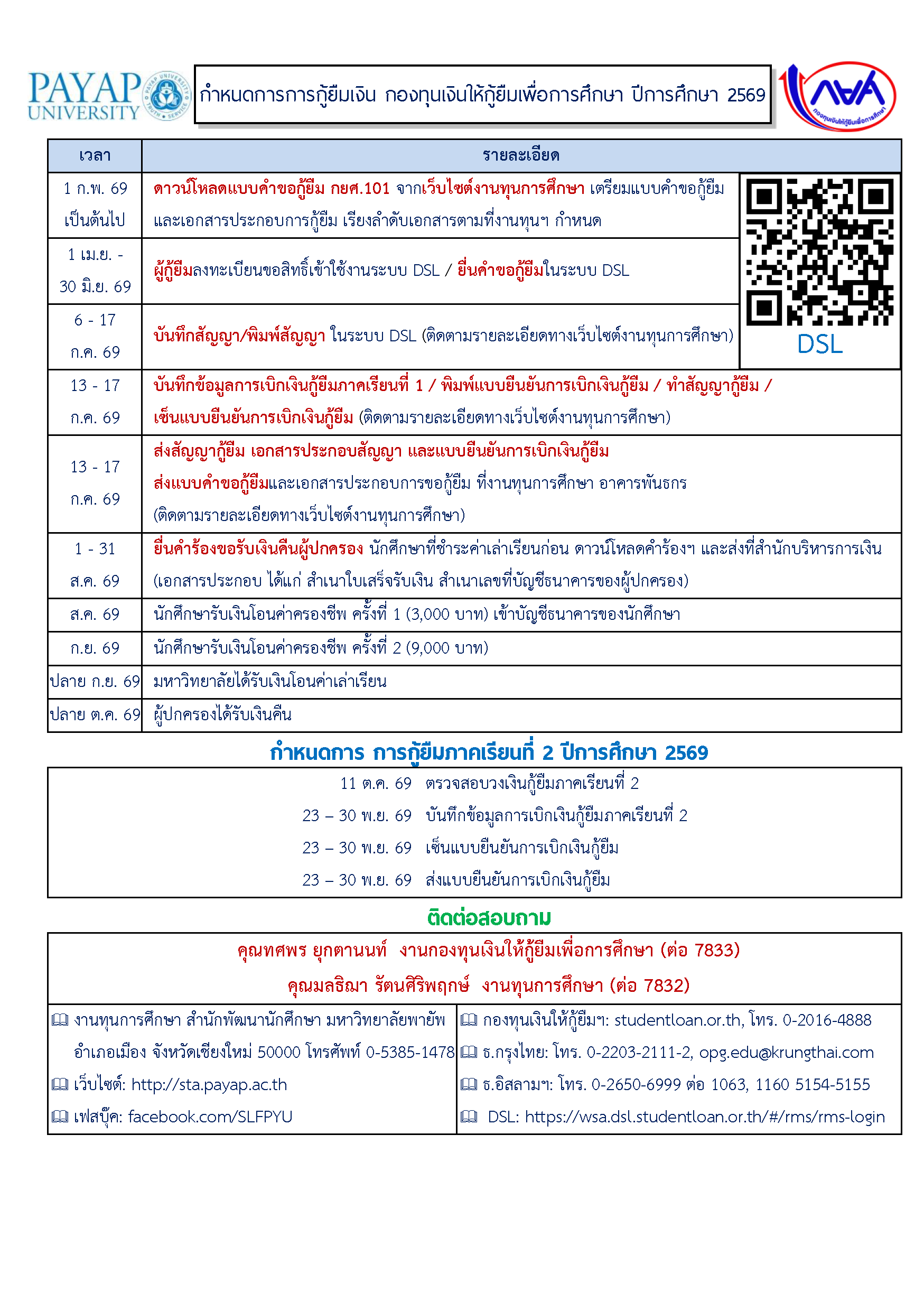 เรื่อง กำหนดการการยื่นคำขอกู้ยืมในระบบ DSL และ การทำสัญญากู้ยืมกองทุนเงินให้กู้ยืมเพื่อการศึกษา